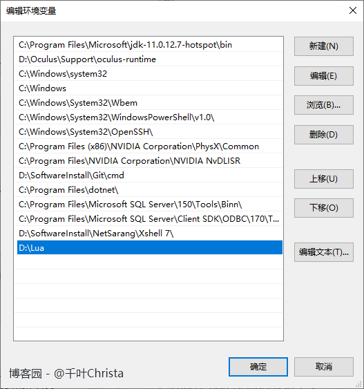 将 lua54.exe 所在的路径添加到环境变量中(上文提到过),完成后依次点击所有“确定”