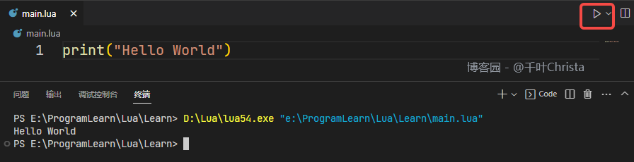 新建一个以 .lua 结尾的文件用于测试,点击运行按钮即可查看结果(直接右键 Run Code 也可以)