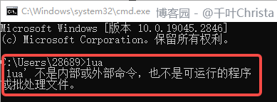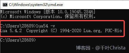 注:命令的名称要与 lua 解释器的名称保持一致。我的 Lua 解释器为 lua54.exe,则命令应为 lua54 -v。如果直接用 lua -v 命令,会显示错误结果